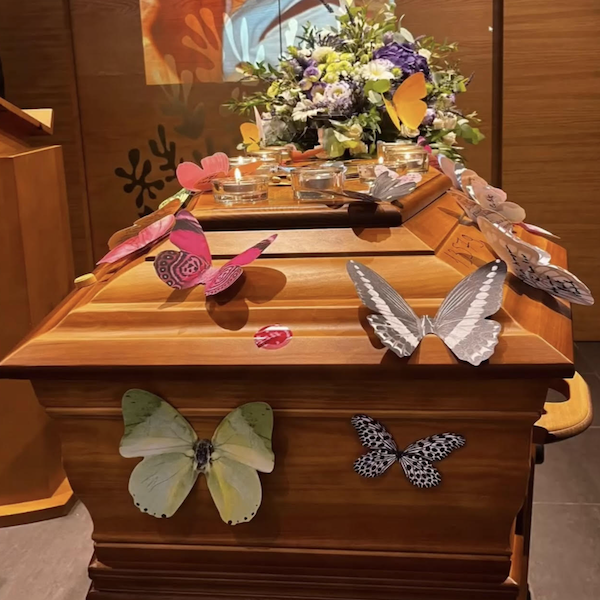 Ces papillons, que vous pourrez choisir selon vos envies, permettent d’ajouter une note douce et personnelle au moment des adieux. Chaque proche a la possibilité d’inscrire un message de souvenir, d’amour ou de gratitude, puis de déposer ce papillon sur le cercueil de l’être cher.